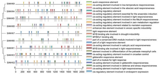 Cis-element analysis of promoters of SiNHX genes. Cis-elements with various regulatory functions were depicted on the 2000 bp promoter region of SiNHX genes, with their positions indicated. A 2000 bp promoter sequence is represented by a dark line, while rectangles in different colors denote various types of cis-elements.