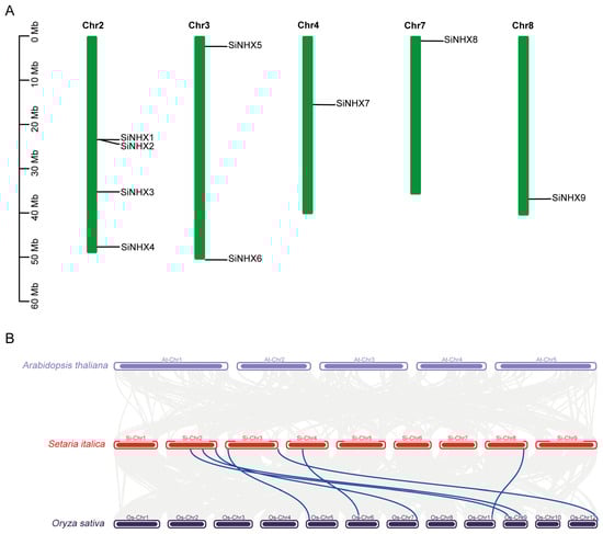 Chromosomal distribution of SiNHX genes and collinearity analysis of NHX genes among three different species. (A) The distribution of 9 NHX genes across 5 chromosomes in foxtail millet. (B) Result of colinearity analysis for NHX genes in three species: Setaria italica, Arabidopsis thaliana, and Oryza sativa. Collinear relationships between NHX genes of different species are highlighted by blue lines.