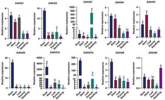 Expression of SiNHX gene family members in different tissues of JG21. Significant differences are analyzed using ordinary one-way ANOVA by Tukey’s method; lowercase letters indicate statistical significance at p < 0.05.