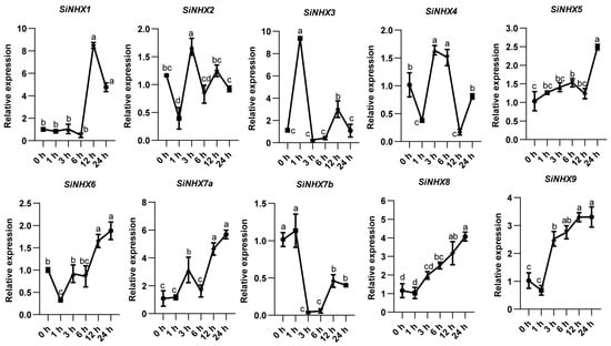Analysis of expression of the SiNHX gene family in roots treated with salt stress. Significant differences are analyzed using ordinary one-way ANOVA by Tukey’s method; lowercase letters indicate statistical significance at p < 0.05.