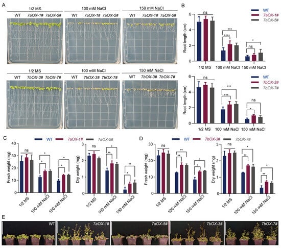 Phenotypic analysis of wild-type (WT) and SiNHX7-OX transgenic Arabidopsis lines under salt stress. (A) Root growth of WT and SiNHX7-OX transgenic seedlings vertically grown on NaCl-containing 1/2 MS medium plates. Scale bar = 1 cm. (B) Main root lengths of WT and SiNHX7-OX transgenic Arabidopsis lines measured 10 days after transfer to plates with NaCl. Data are presented as mean ± SD (n = 30). Significant differences were analyzed by two-way ANOVA followed by Tukey’s multiple comparison test (ns: no significance; * p < 0.05; *** p < 0.001; **** p < 0.0001). (C,D) Fresh weight and dry weight of WT and SiNHX7-OX transgenic Arabidopsis lines measured 10 days after plate transfer. Total weight of 10 plants was measured in triplicate. Data are presented as mean ± SD (n = 3). Significant differences were performed using two-way ANOVA followed by Tukey’s multiple comparison test (ns: no significance; * p < 0.05; ** p < 0.01). (E) Salt tolerance phenotypes of WT and SiNHX7-OX transgenic seedlings grown in soil. Scale bar = 10 cm.