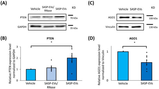 SASP-EVs affect the content of insulin signaling cascade components in young MSCs. (A,B) PTEN protein levels in young MSCs after EVs treatment, representative images (A), and quantification of band intensity (B). Data represent the mean ± SE, n = 5 (points), 5 donors, * p < 0.05. (C,D) AGO1 protein levels in young MSCs after EVs treatment, representative images (C), and quantification of band intensity (D). Vehicle—culture medium without EVs; SASP-EVs—vesicles isolated from the secretome of senescent MSCs; SASP-EVs/RNase—vesicles isolated from the secretome of senescent MSCs and pre-treated by RNase before application. Data represent the mean ± SE, n = 7 (points), 5 donors, * p < 0.05.