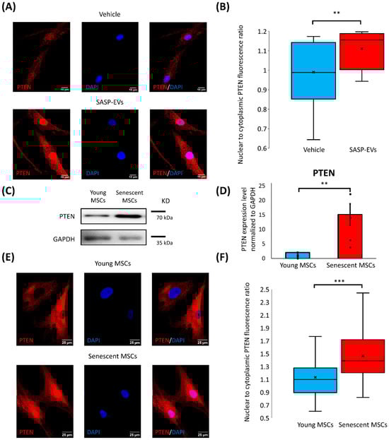 SASP-EVs induce PTEN nuclear import in young MSCs. (A) Immunofluorescent images of PTEN localization in young MSCs without and treated with senescent EVs. (B) Quantification of fluorescence intensity of immunofluorescent images. The distribution of data with median (line), mean (cross), and interquartile range, n = 19–20 individual cells, 2 donors, ** p < 0.01. (C,D) PTEN protein levels in young and senescent MSCs, representative images (C), and quantification of band intensity (D). Data represent the mean ± SE, n = 5–6 (points), 11 donors, ** p < 0.01. (E) Immunofluorescent images of PTEN localization in young and senescent MSCs. (F) Quantification of fluorescence intensity of immunofluorescent images. The distribution of data with median (line), mean (cross), and interquartile range, n = 124–348 individual cells, 7 donors, *** p < 0.001. (A,E) In the immunofluorescent images, PTEN appears in red, while nuclei are stained with DAPI (blue). For the control staining with non-specific IgG, please refer to Supplementary Figure S6.