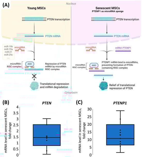 Analysis of PTEN and PTENP1 mRNA levels in young and senescent MSCs. (A) Mechanism of PTENP1 sequestration of microRNAs targeting PTEN. (B) Change in PTEN mRNA level in senescent MSCs. (C) Change in PTENP1 mRNA expression level in senescent MSCs. (B,C) mRNA expression was evaluated using the ΔΔCt method. The distribution of data is shown with individual data points, median (line), mean (cross), and interquartile range, n = 6–8, 8 donors.