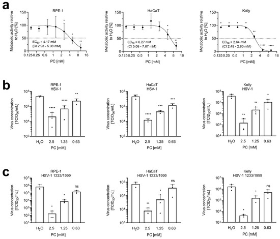 Infection experiments of RPE-1, HaCaT, and Kelly cells were used to determine whether PC treatment revealed inhibitory effects on HSV-1 replication. Cells of all three cell lines were infected with a multiplicity of infection (MOI) of 1.0 using two different HSV-1 strains: the laboratory strain HSV-1 (Figure 1b) and the clinical isolate HSV-1 1223/1999 (Figure 1c). After infection, cells were treated with 0.63 to 2.5 mM PC until 24 h post-infection (p.i.). Overall, a dose-dependent significant reduction in virus replication was observed in all experiments.