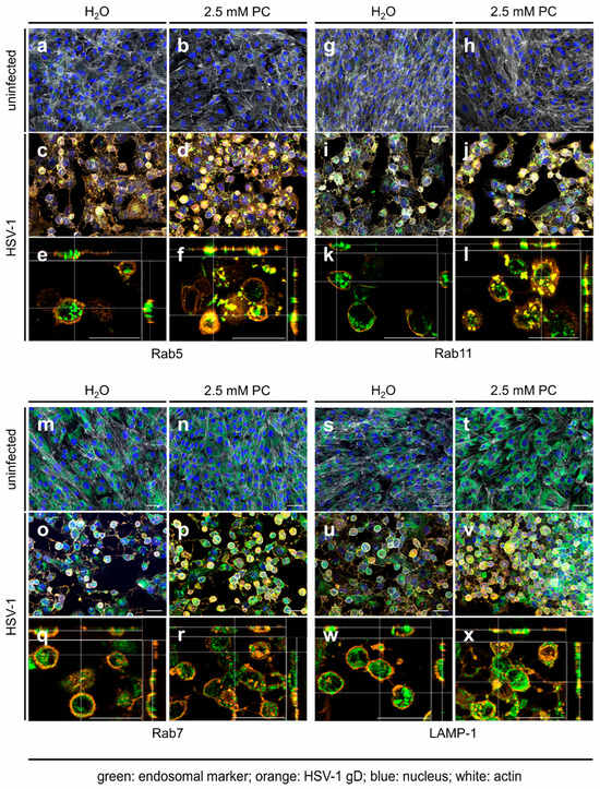 To investigate late replication events of HSV-1 during PC treatment, immunofluorescence microscopy was performed. To study the cellular localization of the viral glycoprotein gD, HSV-1-infected RPE-1 cells were treated with 2.5 mM PC. After 24 h, fixed cells were labeled with antibodies directed against the viral glycoprotein gD, the marker Rab5, specific for early endosomes, (Figure 2a–f), the marker Rab11, specific for recycling endosomes, (Figure 2g–l), the marker Rab7, specific for late endosomes (Figure 2m–r), or the marker LAMP1-1, specific for lysosomes, (Figure 2s–x). Consistent with the cell-associated total viral concentration (Figure S1b), measurement of the mean fluorescence intensity of viral glycoprotein gD in PC-treated, HSV-1-infected RPE-1 cells indicated no increased intensity (Figure S1c). Microscopic images of uninfected RPE-1 cells revealed a weak distribution of the endosome markers Rab5 and Rab11, regardless of whether PC was added or not (Figure 2a,b,g,h). In contrast, HSV-1 infection induced an accumulation of both Rab GTPases (Figure 2c–f,i–l). Furthermore, in H2O-treated cells, HSV-1 mainly localized at the plasma membrane with only partial overlap with both endosomal markers as visible in ortho-view images (Figure 2c,e,i,k). PC treatment, however, resulted in the accumulation of larger intracellular vesicles and a strong correlation and co-occurrence of viral glycoprotein gD together with Rab5 or Rab11, respectively, within these vesicles (Figure 2d,f,j,l, Figure 3 and Figure S2). Both Pearson’s correlation, as well as Manders’ thresholded coefficients show a significant increase in their respective coefficients (Figure 3 and Figure S2).
