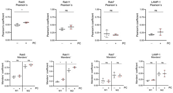 PC treatment increases the correlation and co-occurrence coefficients of Rab5 as well as Rab11, but not those of Rab7 or LAMP1, with HSV-1 glycoprotein gD. The blue channel (nuclei) was processed to receive regions of interest (ROIs) based on Voronoi diagrams in order to approximate cell shapes. Then, Pearson’s and Manders’ thresholded coefficients were determined per ROI. For Manders’, both thresholded coefficients, M1, the fraction of gD signal that co-occurs with protein of interest (POI) signal, and M2, the fraction of POI signal that co-occurs with gD signal, are shown. In total, three images per condition and experiment were analyzed and depicted as the mean (±SD). Statistical significance was analyzed by unpaired two-tailed t-test (* p < 0.05; ns, not significant).