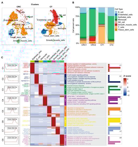 Single cell atlas (A) and cell proportion (B) of colorectal cancer (CRC), representative marker gene expression, and biological functions of different cell groups (C). CRC, colorectal cancer; CT, healthy control group. AIR, adaptive immune response; IRs, immune receptors; APP, antigen processing and presentation; CSR, cell surface receptor; SABP, systemic arterial blood pressure.