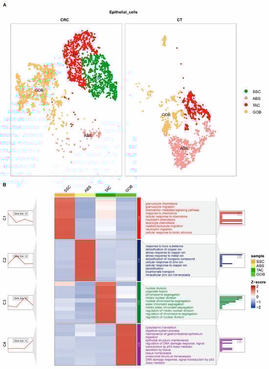 The atlas (A) of four subtypes of epithelial cells for colorectal cancer (CRC) and representative marker gene expression and biological functions of different epithelial cells (B). CRC, colorectal cancer; CT, healthy control group; SSC, specific serrated cells; ABS, absorptive cells; TAC, transit amplifying cells; GOB, goblet cells.
