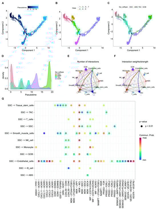 Trajectory analysis of four subgroups of epithelial cells and their interaction with other cells from colorectal cancer (CRC). (A), pseudotime analysis of epithelial cell development, with dark blue representing the early stage and light blue representing the late stage. (B), classify the developmental status of epithelial cells based on trajectory analysis of developmental nodes. (C), the distribution of four different subgroups of epithelial cells along the developmental trajectory. (D), the distribution of cell density along the developmental trajectory of four different subgroups of epithelial cells. (E), comparison of the number of interactions between four different subgroups of epithelial cells and other cells in colorectal cancer. (F), comparison of the intensity of interaction between four different subgroups of epithelial cells and other cells in colorectal cancer. (G), the distribution characteristics of ligand-receptor interactions between the SSC epithelial cell subgroup and all cells. SSC, specific serrated cells; ABS, absorptive cells; TAC, transit amplifying cells; GOB, goblet cells.