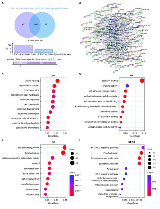Differential analysis between SSCs and non-SSCs across all cell types resulted in a list of differential genes (Table S1). Further differential analysis between SSC and non-SSC epithelial cells yielded a list of SSC-specific differential genes (Table S2). We subsequently extracted common differential genes from these datasets, totaling 246 genes (Figure 5A, Table S3). The PPI network confirmed the existence of varying degrees of interaction between these genes (Figure 5B). Molecular component analysis (Figure 5C) indicated that these genes are primarily involved in focal adhesion, extracellular matrix, and melanosomes. From a molecular function perspective (Figure 5D), these genes are predominantly involved in cadherin binding, cytokine activity, and cell–cell adhesion. In terms of biological processes (Figure 5E), these common differential genes are primarily involved in wound healing, leukocyte migration, and cell–cell adhesion. Detailed results of the GO analysis for these genes are shown in Table S4. Pathway enrichment analysis (Figure 5F) demonstrated that these genes are mainly involved in pathways such as the PI3K–Akt signaling pathway, focal adhesion, and HIF-1 signaling pathway, which are related to metabolism (Table S5). These findings suggest that these common differential genes may play critical roles in specific biological processes and signaling pathways, particularly in cell adhesion, tissue repair, and immune response. Moreover, the significant enrichment of these genes indicates their involvement in SSCs’ adaptation and response mechanisms within specific pathological environments, providing new perspectives and potential therapeutic targets for further understanding the role of SSCs in disease onset and progression.