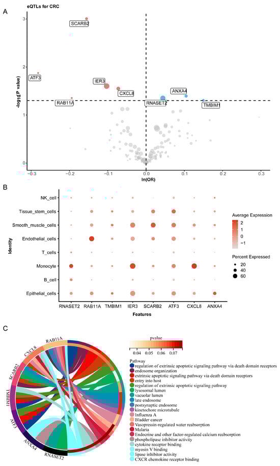 Mendelian randomization (MR) analysis was used to screen the causal relationship between the expression quantitative trait loci (eQTL) of differentially expressed genes and colorectal cancer (CRC), as well as to analyze the expression levels and functional enrichment of candidate genes. (A), the volcano plot shows the results of MR analysis between the differential gene eQTL related to specific serrated cells (SSCs) and CRC, where red and blue represent genes with significant MR analysis, and gray represents genes without significant MR analysis. (B) The bubble plot displays the expression levels of significant genes analyzed by MR in different cell groups of CRC single-cell data. (C). Functional enrichment analysis of significant genes in MR analysis.
