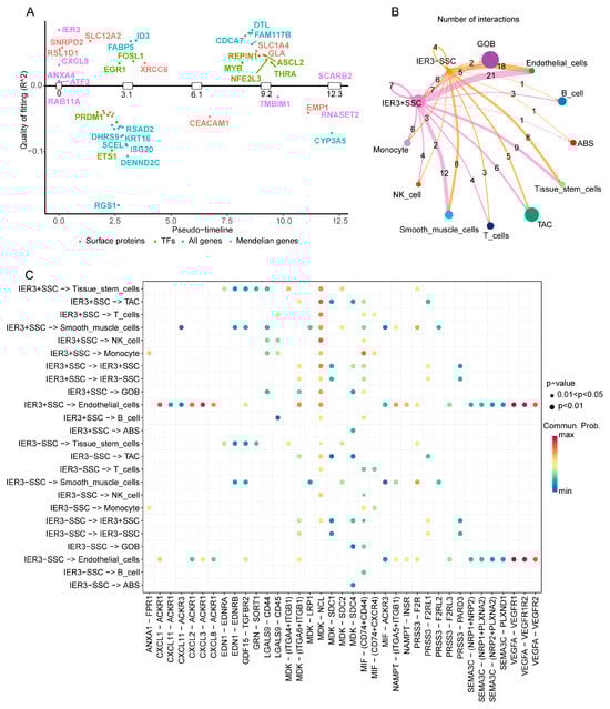 Switchgenes analysis for differential genes and cell chat analysis between specific serrated cells (SSCs) and other cells based on high and low expression of switch genes. (A), analysis of switch gene categories based on pseudotime from trajectory analysis. (B), cell chat number between SSCs with high and low expression of IER3 and other colorectal cancer (CRC) cells. (C), the distribution characteristics of ligand-receptor interactions between SSCs with high and low expression of IER3 and other CRC cells. TF, transcription factor; SSC, specific serrated cells; ABS, absorptive cells; TAC, transit amplifying cells; GOB, goblet cells.