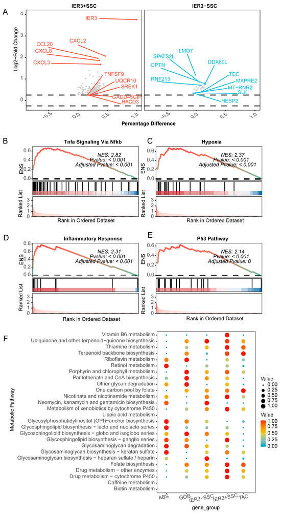 Differential analysis (A) and representative GSEA results (B–E) of specific serrated cells (SSCs) between high and low expression groups of IER3, as well as the regulation of metabolic pathways (F) by IER3 high and low expression. ENS, enrichment score; SSC, specific serrated cells; ABS, absorptive cells; TAC, transit amplifing cells; GOB, goblet cells.