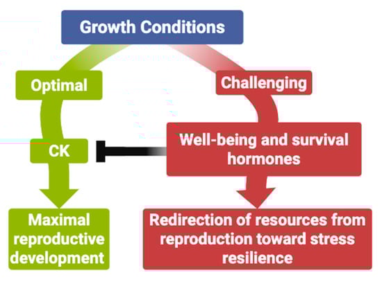 From an evolutionary perspective, it is reasonable to propose that a complex and fitness-defining trait like reproductive maximization would be governed by a single, dedicated hormonal module. Centralizing control in this way likely enhances robustness by minimizing signal conflict and ensuring consistent activation under favorable conditions. However, under adverse environmental conditions, the CK pathway is actively downregulated by hormone systems specialized in promoting survival—a regulatory shift that is well-documented [