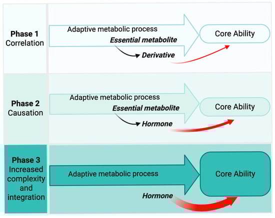 Causation Phase—Through mutation, these metabolic derivatives began to actively promote the functions they once merely reflected, shifting the relationship from correlation to causation and establishing their role as hormones.
