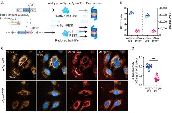 The CRISPR/Cas9 system was employed to insert a PEST sequence at the C-terminus of the SNCA gene within H4 neuroglioma cells (Figure 1A). This genetic modification resulted in an endogenous α-Syn protein that is fused to the PEST sequence, which is known to be a signal for rapid degradation via the proteasomal pathway [,,]. Consequently, the half-life of α-Syn in these cells is expected to be significantly reduced, enabling the detection of changes in α-Syn levels within shorter time frames. To ensure consistent degradation dynamics, single-cell clones with a homozygous integration of the PEST sequence were preferred, as a residual wild-type α-Syn would exhibit its native, longer half-life, potentially interfering with assay accuracy and reproducibility. The selected clone, identified based on its optimal signal-to-background ratio using homogeneous time-resolved fluorescent (HTRF) assay, underwent next-generation sequencing (NGS). Our results confirmed the accurate and homozygous insertion of the PEST sequence at the C-terminus of the SNCA gene locus (Supplementary Figure S1). Quantitative analysis using HTRF protein assay (Figure 1B) and Immunocytochemistry (ICC, Figure 1C,D) demonstrated a significant reduction in the overall protein levels of the PEST-tagged α-Syn (α-Syn-PEST) compared to its wild-type (WT) counterpart. This reduction is likely attributed to the accelerated degradation of the PEST-tagged form of α-Syn, reflecting a high turnover rate. Importantly, ICC staining comparing α-Syn-WT to α-Syn-PEST cells indicated that the intracellular distribution of α-Syn remained unaffected by the insertion of the PEST sequence (Supplementary Figure S2).