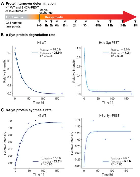 Long protein lifespans increase the susceptibility to aggregation and misfolding, as supported by the existing literature [,,]. This phenomenon poses significant challenges to the study of long-lived proteins and substantially complicates drug discovery efforts. α-Syn is a prime example; its prolonged half-life and propensity to form toxic oligomers and fibrils render it particularly difficult to investigate and therapeutically address [,,]. Detecting changes in proteins with slow turnover rates, such as α-Syn, often necessitates extended exposure times to experimental compounds, which frequently proves impractical in high-throughput drug screens.