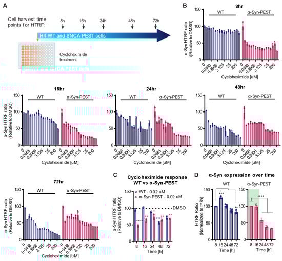 To elucidate the impact of the engineered cell line with a short-lived α-Syn, we used Cycloheximide, a translational inhibitor known to suppress general protein synthesis [,]. This inhibitor allowed us to evaluate the decline in existing α-Syn levels without interference from newly synthesized proteins. By comparing the two cell lines, α-Syn-WT and α-Syn-PEST H4 cells, we evaluated the influence of Cycloheximide on α-Syn protein levels in the context of the reduced protein half-life. To do so, we exposed both cell lines to various concentrations of Cycloheximide for 8, 16, 24, and 48 h (Figure 3A). Protein levels were quantified using an HTRF assay, with HTRF ratios of Cycloheximide-treated cells normalized to DMSO-treated cells at each respective time point. In the α-Syn-PEST cell line, reductions in protein levels were apparent after just 8 h of Cycloheximide incubation, whereas α-Syn-WT cells showed no evident change at that time point (Figure 3B). In WT cells, a reduction in α-Syn became notable after 24 h, reaching a maximum decrease of 50%, consistent with the approximately 27 h half-life of α-Syn-WT determined by SILAC (Figure 2). After 48 h and 72 h, we observed a more pronounced decrease in α-Syn-WT levels, while in the α-Syn-PEST cells with the shorter half-life, the effect of Cycloheximide relative to untreated cells began to plateau, suggesting a narrowing assay window (treated/untreated; signal/background, Figure 3C). Importantly, these data indicate that at early time points, which enable a more efficient screening setup (8–16 h), the α-Syn-PEST cell line provides a significantly superior assay window even at low doses (0.02 µM) of Cycloheximide (Figure 3C).