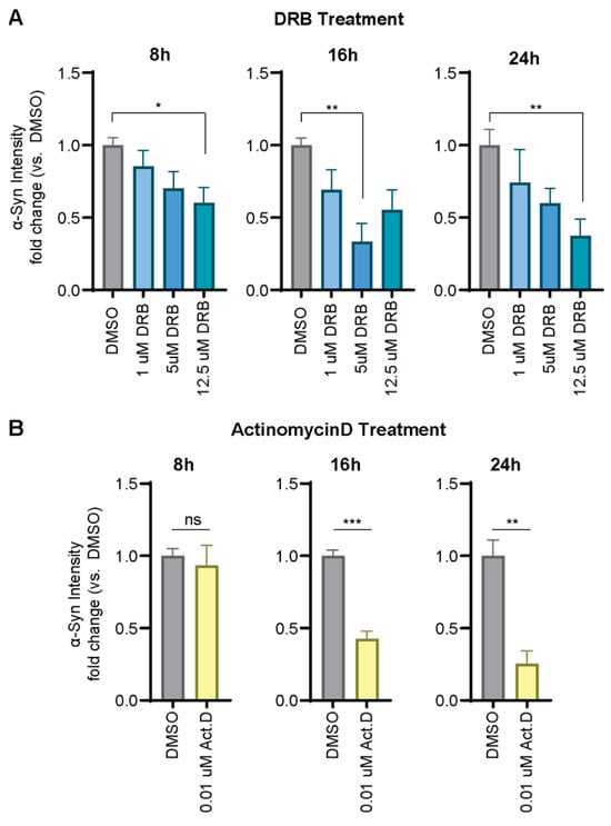 To explore the broader range of applicability of the α-Syn-PEST cell line, we assessed its suitability to detect transcriptional inhibition. Therefore, we treated the cells with transcriptional inhibitors DRB (5,6-Dichloro-1-beta-D-ribofuranosylbenzimidazole), which targets RNA polymerase II, and Actinomycin D, which intercalates DNA to prevent RNA polymerase movement. α-Syn-PEST cells were exposed to varying concentrations of these compounds (Figure 4A,B) and α-Syn levels were assessed using ICC, normalized to DMSO-treated control cells. Similar to findings with the translational inhibitor Cycloheximide (Figure 3), we observed changes after 8–16 h of treatment and trending dose-dependent reductions in α-Syn expression with increasing concentrations of transcriptional inhibitors (Figure 4A,B). These data demonstrate the utility of the α-Syn-PEST cell line as a valuable tool for studying and screening effects on protein levels through distinct mechanisms.