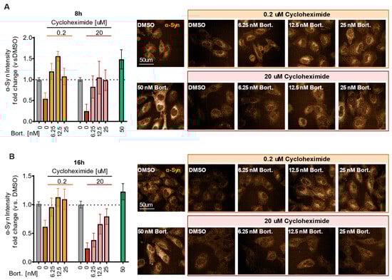 To determine whether the differentiated α-Syn reduction in the α-Syn-PEST cell line compared to its wild-type counterpart is driven by proteasomal degradation, we exposed the cells to a dual-treatment approach using Cycloheximide and Bortezomib, a known proteasome inhibitor. Cells were treated with increasing concentrations of Bortezomib (6.25–50 nM) alongside high (20 µM) or low (0.2 µM) concentrations of Cycloheximide (Figure 5). DMSO and 50 nM Bortezomib treatments were used as negative and positive controls, respectively. The aim of this experiment was to determine whether Bortezomib could counteract the Cycloheximide-induced reduction in α-Syn. Notably, Bortezomib treatment led to a rescue of α-Syn levels as early as 8 h (Figure 5A) and 16 h (Figure 5B). As expected, our data indicate that a rapid reduction in α-Syn was driven by the proteasomal degradation pathway.