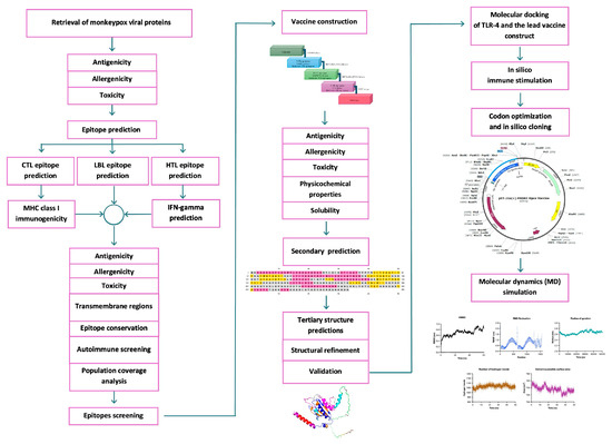 The mutation rate of MPXV was 6–12-fold greater than previously expected, and some of these mutations led to increased transmissibility and immune evasion. Thus, there is an urgent need for novel vaccine design methods [12,17]. The drawbacks of conventional vaccine development include low throughput, high cost, and high time consumption, as well as the need for pathogen culture and the identification of immunogenic components [18,19]. To address these shortcomings in conventional vaccine development, reverse vaccination approaches have revolutionized vaccine design, thus enabling scientists to identify immunogenic components and highly conserved epitopes from genome sequence and proteome information without the need to isolate and culture the targeted pathogen and, thus, offering time and resource savings [20].
