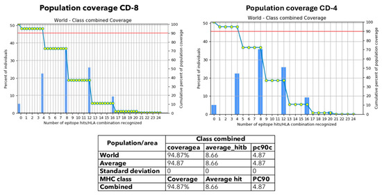 Worldwide population coverage of selected CTL and HTL epitopes for vaccine development. Population coverage analysis of the selected CTL and HTL epitopes was performed using the IEDB tool, based on the distribution of HLA class I and II alleles.