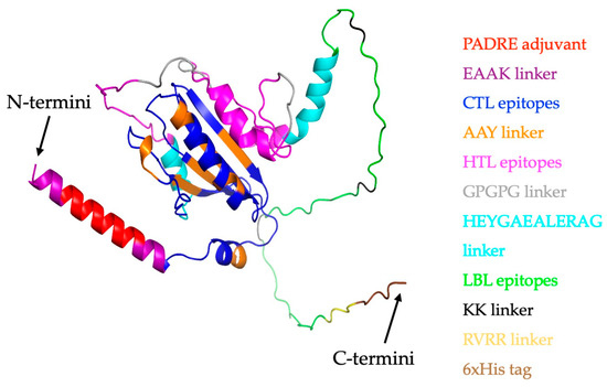 The design of the vaccine construct was formulated by combining five elements, including an adjuvant, nine CTL epitopes, four HTL epitopes, four LBL epitopes, and a 6xHis tag, with the help of linkers, as illustrated in Figure 3. Linkers have been reported to provide stability to vaccine constructs and prevent cross-interruption of each epitope, thus allowing them to independently function upon vaccination [39,40].