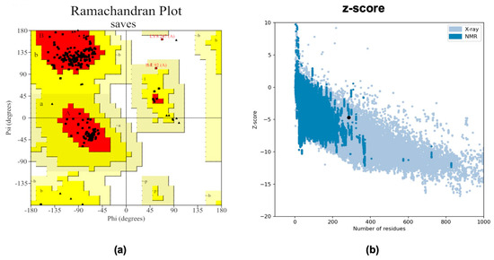Model 1 was further validated with the SAVES 6.0 server by ERRAT and PROCHECK. The selected model exhibited a quality score of 78.7149% in accordance with ERRAT. According to the plot of PROCHECK for evaluation via Ramachandran, 94.7% of the residues were found in the preferred region, and 5.3% were found in the allowed region, as shown in Figure 6a. Additionally, the ProSa-Web server was used to compute the z-score of the model. The z-score calculated by the ProSa-web server was −6.42, as shown in Figure 6b. Collectively, the results from ERRAT, PROCHECK, and ProSa-Web indicated the excellent quality of the predicted three-dimensional model.