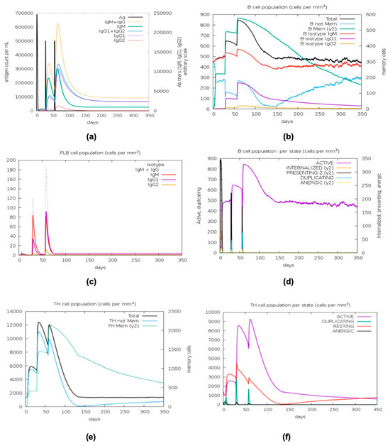 The C-IMMSIM v10.1 server was used to predict the immunization efficacy of the candidate vaccine. The results from stimulation using the candidate vaccine included B cells, helper T cells, cytotoxic T cells, natural killer (NK) cells, macrophages (MAs), dendritic cells (DCs), and certain cytokines. The PADRE vaccine triggered IgM and IgG production after primary immunization and elevated the production of IgM, IgG1, and IgG2 after the secondary and tertiary responses, as shown in Figure 7a,c. In line with the elevated antibody titer, total B-cell populations, particularly B isotype IgM and memory B-cell populations, were induced after the first injection (Figure 7b). The total B cell, IgM, memory B cell, and IgG1 populations were dramatically elevated, while the B isotype IgG2 was also induced after the second and third injections, as shown in Figure 7b. Noticeably, a decrease in the antigen concentration was detected, as shown in Figure 7a, and these phenomena resulted from the generation of a memory B-cell population (Figure 7b). Additionally, Figure 7c indicates that the plasma B lymphocyte count (isotype: IgM + IgG) was noticeably elevated. The active B-cell population per state increased significantly and became consistently high after immunization, as demonstrated in Figure 7d. According to Figure 7e, the total helper T-cell population increased significantly after the first, second, and third injections. In particular, both memory and nonmemory helper T cells were elevated. Likewise, the active and resting helper T-cell populations per state could be elevated significantly, as indicated by Figure 7f. Although the resting cytotoxic T-cell population per state decreased after the first immune response, it dramatically increased over time after the tertiary immune response, as shown in Figure 7g. Total NK cells, the total MA population per state, especially the resting MA population, and the DC population per state (for both active and resting states) were also generated by immunization, as demonstrated in Figure 7h–j. As shown in Figure 7k, the titer of interferon-γ (IFN-γ) was significantly increased by all three injections. Increased transforming growth factor-β (TGF-β), interleukin 10 (IL-10), and interleukin 12 (IL-12) levels were observed. An elevated danger level D in the same figure indicates that the risk is extremely low. This represented a favorable reaction to immunization.