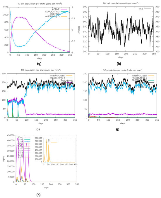 The graphs representing the immunization simulation by the C-IMMSIM server. (a–d) Levels of the B lymphocyte population after vaccination. (e,f) Helper T-cell population after vaccination. (g) Cytotoxic T-cell population after vaccination. (h) The levels of total NK cells, (i) total MA population per state, and (j) DC population per state. (k) Levels of cytokines and interleukin concentrations, with the inset plot indicating the danger signal together with leukocyte growth.