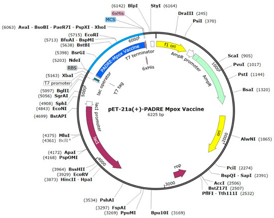 Codon optimization was performed using the Java Codon Adaptation Tool (JCAT) for protein expression in E. coli. The protein sequence of the PADRE vaccine was reverse-translated to the DNA sequence. The DNA sequence was submitted to the JCAT server for codon optimization. The codon adaptation index (CAI) and GC content of the codon-optimized sequence were 1.0 and 51.11%, respectively (Appendix A Figure A11). These scores indicated that the optimized nucleotide sequence was within the range of the optimum CAI (0.8–1.0) and GC content (30–70). Finally, the optimized nucleotide sequence above was in silico cloned by insertion into the pET21a vector digested with the NdeI and XhoI restriction enzymes using SnapGene 7.2.1, resulting in the recombinant plasmid pET-21a(+)-PADRE Mpox vaccine-6xHis tag, as shown in Figure 8.