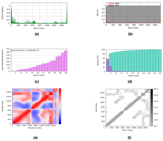 Graphs representing normal mode analysis (NMA) of the iMOD server. (a) The main-chain deformability. (b) B-factor graph (RMSD values). (c) Eigenvalue for structural deformation. (d) Individual variance and cumulative variance. (e) Atomic motion in the regions of MD. (f) Maps of the elastic network.