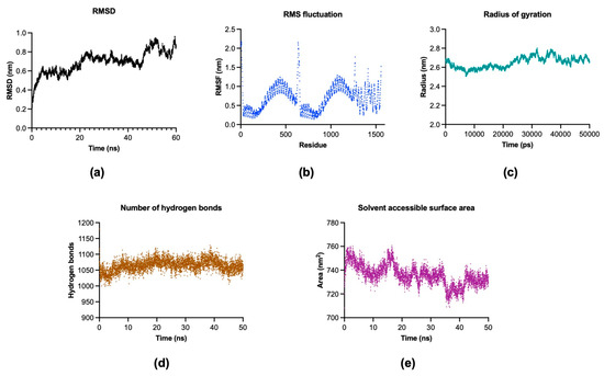 Graphs illustrating the results of molecular dynamics using GROMACS software. (a) RMSD, (b) RMSF, (c) Rg, (d) number of H bonds, and (e) the SASA.