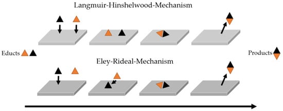 Schematic representation of the Langmuir–Hinshelwood and Eley–Rideal Mechanisms in heterogeneous catalysis. In both cases, a black triangle (educt) and an orange triangle (educt) react to form a black–orange product [