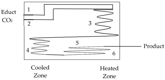 2 at (2). The reaction occurs in zone (3). Flow and pressure are regulated by (4). After expansion in (5), the product exits at (6). The reactor includes a cooled and a heated zone [