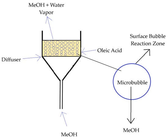 Schematic illustration of a microbubble reactor: methanol is introduced into oleic acid through a diffuser, forming microbubbles that create a reaction zone at their surface [