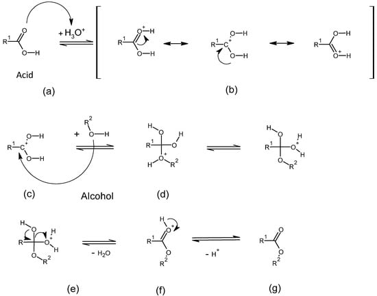 10]. This protonation makes the carbonyl carbon more electrophilic (b), facilitating a nucleophilic attack by the alcohol’s oxygen atom (c). This attack leads to the formation of a tetrahedral intermediate (d), which subsequently undergoes an intramolecular proton transfer. Water is eliminated (e), and this results in ester formation (f, g) [