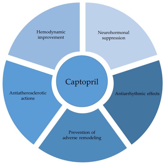 Undoubtedly, captopril, along with other ACE inhibitors, has found its place as a first-line therapy of arterial hypertension in leading guidelines [] and a milestone in the treatment of HF with reduced ejection fraction (EF) [], bringing about a major improvement in the therapy of these common health states. Notably, captopril’s application has extended beyond its primary indications, proving beneficial in various diseases and experimental conditions such as rheumatoid arthritis [], experimental systemic lupus erythematosus-like disease [,], animal model of arthrofibrosis and osteoarthritis [], proteinuria [], alcohol-induced pancreatic fibrosis in rats [], acute pancreatitis-associated lung injury [], amiodarone-induced lung fibrosis [], pulmonary hypertension in connective tissue diseases [], experimental tumors [], complications of insulin-dependent diabetes mellitus or model of induced diabetes mellitus [,,,], experimental autoimmune myocarditis [], chemoprevention of hepatocellular carcinoma [], experimental hepatic fibrosis [], irradiation erythroid recovery [], and Alzheimer’s disease [], etc.