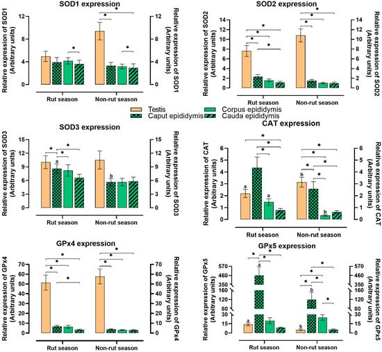 Relative mRNA abundance of the analyzed genes in the reproductive tissues of male European red deer in rut and non-rut seasons. SOD1 expression—relative abundance of cytoplasmic copper/zinc superoxide dismutase mRNA; SOD2 expression—relative abundance of manganese superoxide dismutase mRNA; SOD3 expression—relative abundance of extracellular superoxide dismutase mRNA; GPx4 expression—relative abundance of glutathione peroxidase 4 mRNA; GPx5 expression—relative abundance of glutathione peroxidase 5 mRNA; CAT expression—relative abundance of catalase mRNA. The mean (±SEM) values of relative mRNA abundance are presented. a, b—significant at p ≤ 0.05 between seasons. Values marked with * denote significant differences at p ≤ 0.05 between the analyzed tissues in each season.