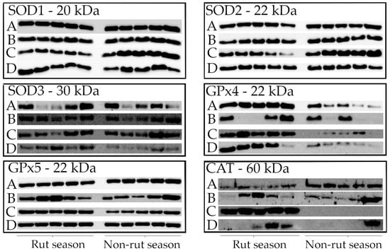 The western blot technique was used to determine the protein content of tissues sampled from randomly selected animals (n = 5 in the rut season; n = 5 in the non-rut season) (Figure 3). Tissue samples were loaded onto gels in the same sequence. All analyzed proteins were identified. SOD1, SOD2, and SOD3 proteins were detected in all animals, which corroborates the results of gene expression and enzyme activity analyses. The results of GPx4, GPx5, and CAT protein analyses were also consistent with the gene expression data.