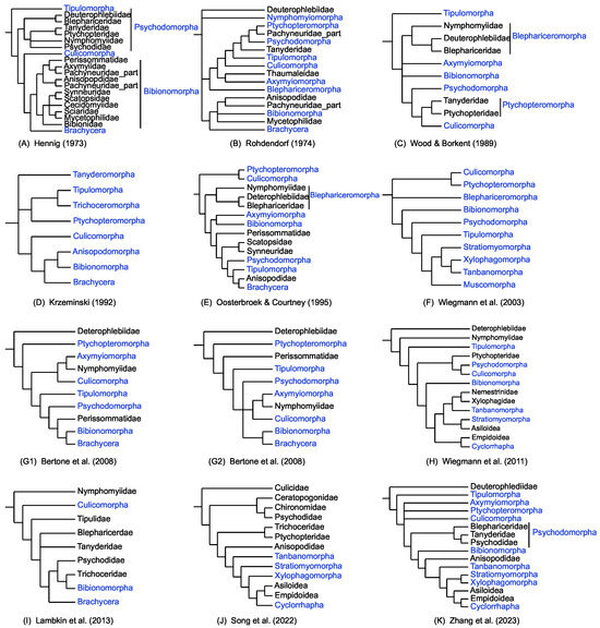 - Oosterbroek, P.; Courtney, G. Phylogeny of the nematocerous families of Diptera (Insecta). Zool. J. Linn. Soc. 1995, 115, 267–311. [Google Scholar] [CrossRef]