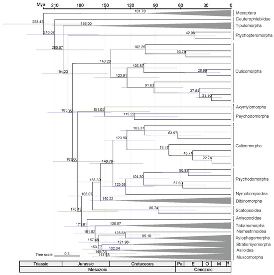 - Bertone, M.A.; Courtney, G.W.; Wiegmann, B.M. Phylogenetics and temporal diversification of the earliest true flies (Insecta: Diptera) based on multiple nuclear genes. Syst. Entomol. 2008, 33, 668–687. [Google Scholar] [CrossRef]