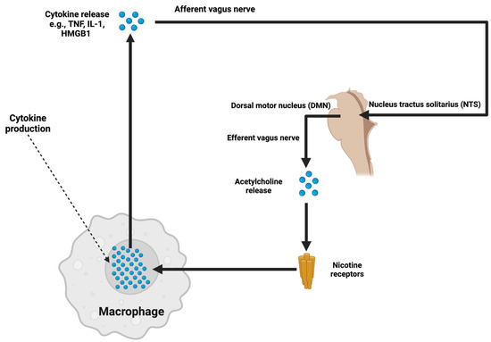 Illustrates the cholinergic anti-inflammatory pathway, in which afferent signals from inflammatory cytokines, such as TNF-α and IL-1, activate the vagus nerve. This activation is processed through the nucleus tractus solitarius (NTS) and dorsal motor nucleus (DMN) in the brainstem. The efferent vagus nerve subsequently releases acetylcholine, which binds to nicotinic receptors on macrophages, inhibiting cytokine production. By suppressing neuroinflammatory pathways, this mechanism has the potential to attenuate ICP elevation caused by cytokine-mediated disruption of the blood–brain barrier and glymphatic dysfunction.