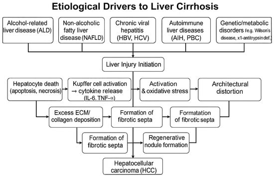 The increasing global prevalence of non-alcoholic fatty liver disease (NAFLD), closely related to obesity and metabolic syndrome, has emerged as a major driver of cirrhosis. NAFLD is primarily defined by excessive accumulation (steatosis) and can evolve to non-alcoholic steatohepatitis (NASH), a more severe inflammatory state that predisposes to fibrosis, cirrhosis, and eventually hepatocellular carcinoma []. Recent reviews highlight that NAFLD has transitioned to becoming one of the leading causes of cirrhosis in various populations, especially with increasing rates of obesity worldwide [,].