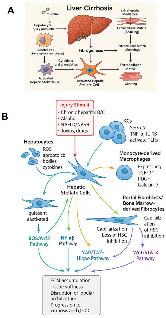 Integrated cellular and molecular pathways driving fibrogenesis in liver cirrhosis. (A) mechanistic changes occurring during progression toward liver cirrhosis, (B) molecular scaffold of changes occurring during progression toward liver cirrhosis.