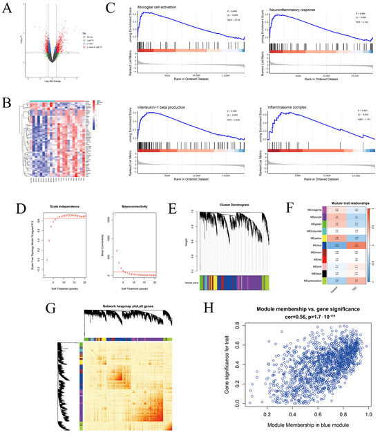 General exploration, GSEA, and WGCNA of the EGAS00001002485 dataset. (A) The volcano map shows the changes in mRNA expression in cortical tubers, and the red dots represent the differentially expressed genes. (B) Heatmap showing the top 50 differentially expressed genes, with red representing high expression and blue representing low expression. (C) GSEA revealed that pathways related to the neuroinflammatory response, microglial cell activation, the inflammasome complex, and IL-1β production were significantly enriched. (D) R2 was set to 0.85 (left red line), and the function was used to automatically filter 7 as the optimal soft threshold. The red line in the image on the right represents the mean connectivity when the soft threshold is 7. (E) Clustering tree and module delineation of co-expressed gene modules of TSC. (F) The module–trait relationships of the 11 gene modules associated with TSC were analyzed, and the blue module presented the highest correlation with TSC. (G) The topological matrix heatmap of the modular gene co-expression network shows high intermodule differentiation and high intramodule gene correlation. (H) The scatter plot revealed that genes in the blue module were positively correlated with TSC (cor = 0.56, p = 1.7 × 10−119).