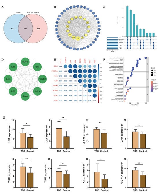 Identification of inflammasome-related hub genes. (A) Venn diagram showing 617 intersecting genes. (B) PPI network analysis reveals interactions between proteins encoded by 53 GAMNIs. (C) An UpSet diagram demonstrating the specifics of 8 algorithms of CytoHubba for screening inflammasome-related hub genes, and 8 genes were screened. Each dot represents a certain algorithm to its left, and the numbers on the bar graph represent the number of genes selected by each algorithm below it. (D) PPI network analysis revealed interactions between proteins encoded by inflammasome-related hub genes. (E) Correlation analysis between inflammasome-related hub genes revealed that these genes were positively correlated. (F) GO enrichment analysis of inflammasome-related hub genes. (G) Significance analysis of differences in inflammasome-related hub genes. ns p > 0.05, * p < 0.05, ** p < 0.01.