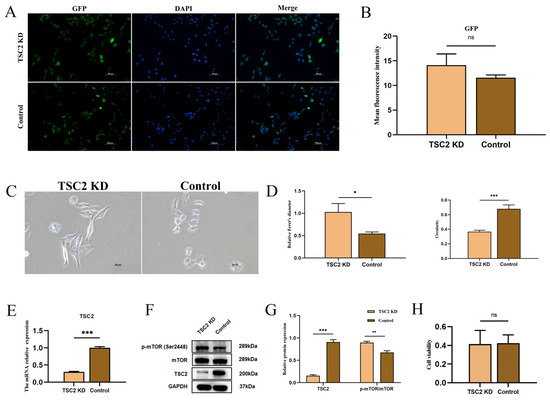 TSC2 KD microglia model construction. (A) HMC3 cells expressed GFP fluorescence after transfection with lentivirus. (B) Comparison of the GFP fluorescence intensity between the two groups. (C) Morphology of microglia after lentiviral transduction. (D) TSC2 KD cells have increased Feret’s diameter and decreased circularity. (E) The mRNA level of TSC2 was reduced in the TSC2 KD group. (F,G) The protein level of TSC2 and the phosphorylation of mTOR were detected by Western blot. Compared with control microglia, TSC2 KD microglia presented significantly lower TSC2 protein expression and significantly higher phosphorylation levels of mTOR. (H) A CCK-8 assay revealed no significant difference in microglial activity between the two groups. N = 3; ns p > 0.05, * p < 0.05, ** p < 0.01, *** p < 0.001.