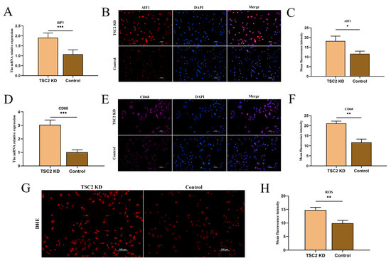 Detection of HMC3 cell activation and ROS levels. (A) The mRNA level of AIF1 was elevated in the TSC2 KD group. (B,C) AIF1 fluorescence intensity was greater in TSC2 KD HMC3 cells than in control HMC3 cells. (D) The mRNA level of CD68 was elevated in the TSC2 KD group. (E,F) The CD68 fluorescence intensity of TSC2 KD HMC3 cells was greater than that of control cells. (G,H) The intensity of ROS fluorescence in TSC2 KD HMC3 cells was greater than that in control cells. DHE: Dihydroethidium; N = 3; * p < 0.05, ** p < 0.01, *** p < 0.001.
